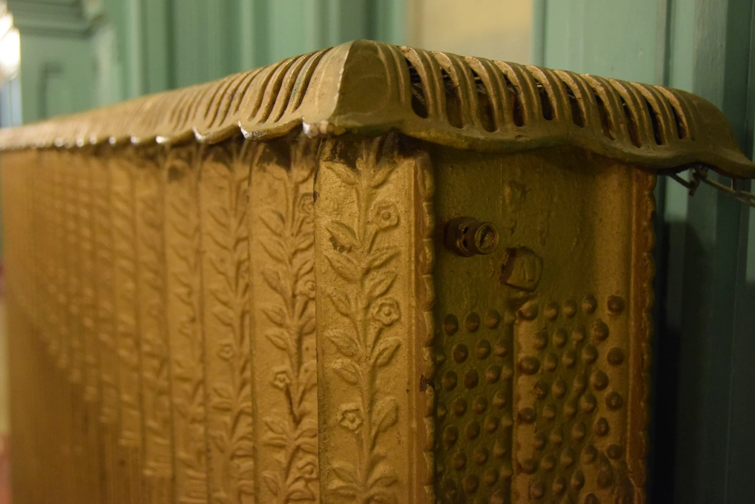 A radiator with an elaborate gold cover. These details are gorgeous.