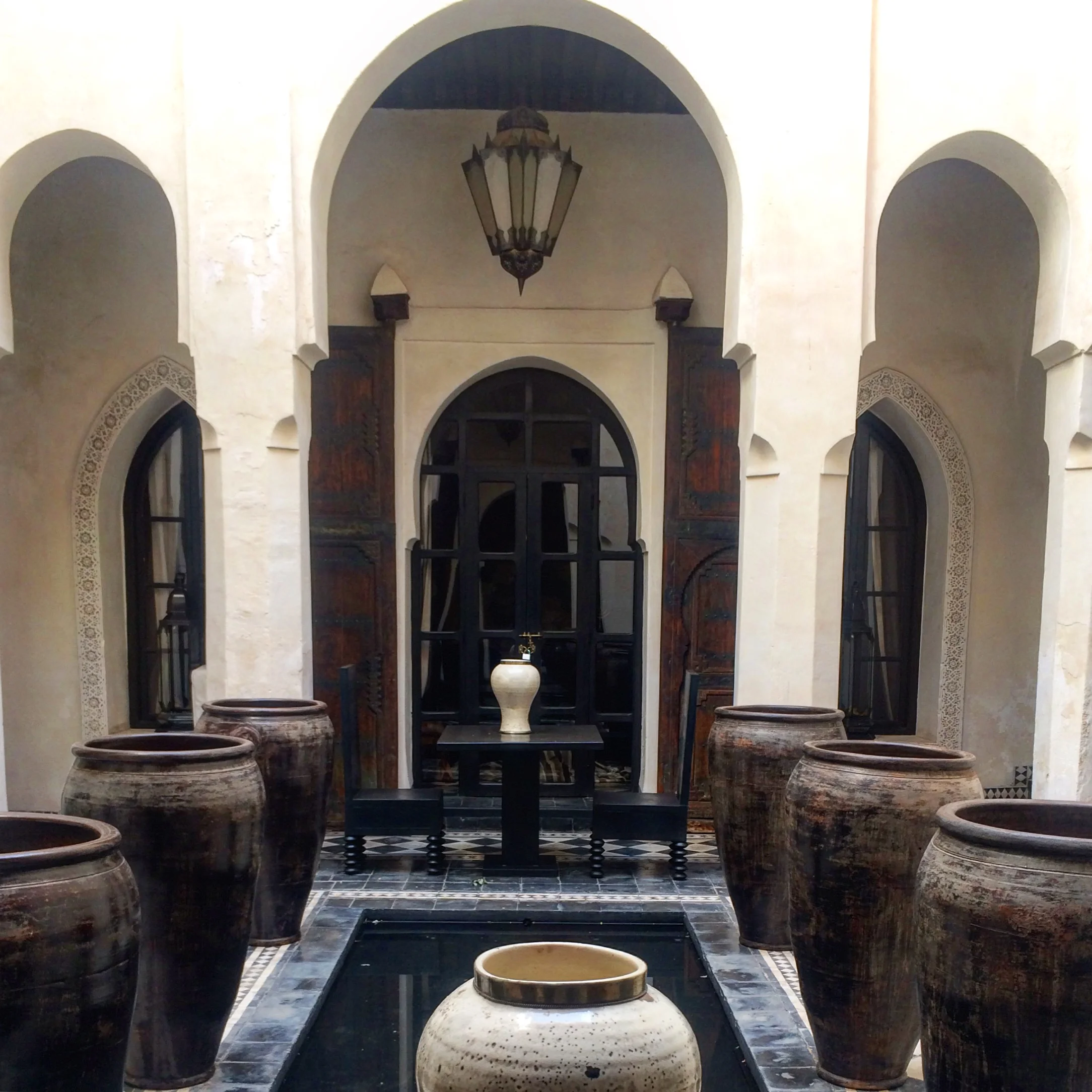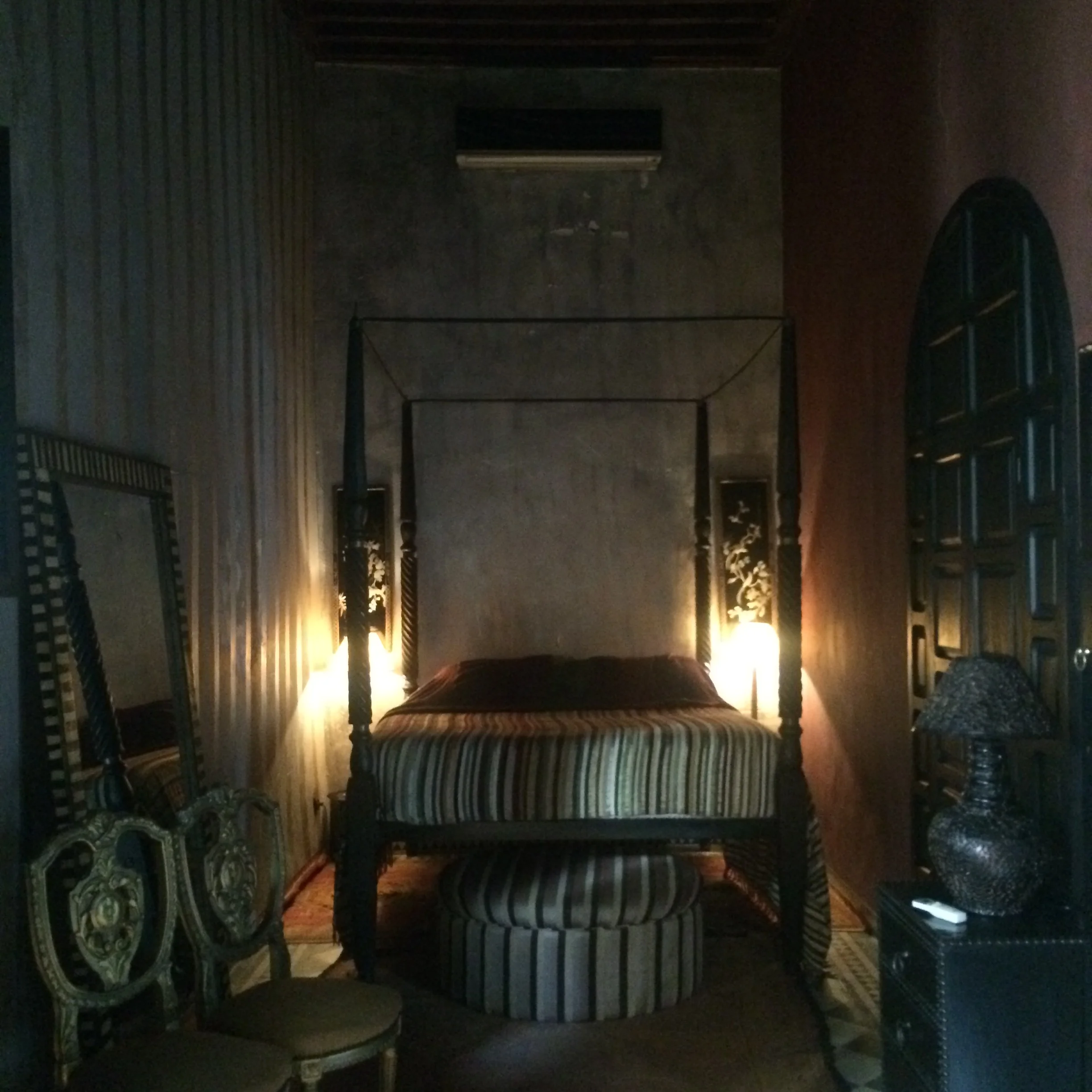 I research and research. I am super picky about where I sleep, and in general, I don't do traditional hotels unless it's a last minute situation. Hotels are overpriced, and usually sterile. I picked a ryaid, a traditional Moroccan palace that's kinda like a bed and breakfast because well, the architecture is dope and we don't have them in the US.. I picked this specific ryaid because the decor was kind of like Morocco-meets- shabby chic, Old World--meets-new and black-and-white, our room had a balcony and there was a rooftop pool. A review said it was a bit off the beaten path, but worth the trek. And it was close to the hotel where our friends are staying.