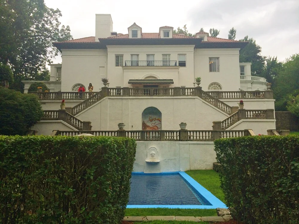 The house still has many of its original features, including most of the light fixtures and chandeliers and a piano trimmed in gold leaf. Most of the bathrooms have the original tubs, and one has the original rain forest showerhead. A tour guide speculates that the inground pool in the backyard might be a black first. Hmmm.