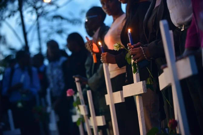 People hold candles alongside wooden crosses at Freedom-Corner in Uhuru Park in Nairobi, Kenya, April 7, 2015, during a vigil for the victims of an attack claimed by Somalia’s al-Qaida-linked al-Shabab insurgents at Garissa University College, in which 148 people were killed.