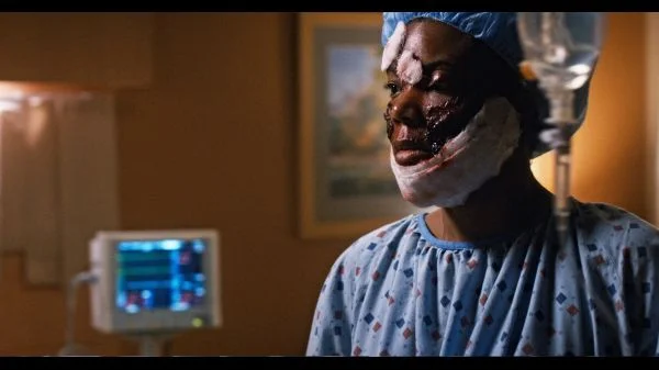 Kara is waiting for MJ in her hospital room. Her face is f---ed. Geez Louise. MJ sees the covered mirror and if she didn’t know how bad it was before, she does now. She demands Kara remove the paper from the mirror. Kara refuses, explaining that she should wait for the plastic surgeon to arrive and explain the injuries and what can be done about them “in context”.